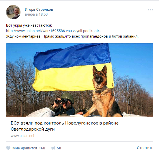 Когда бой за эту территорию завершился, тот же Гиркин сцепив зубы опубликовал новость с едким комментарием: "Вот укры уже хвастаются".