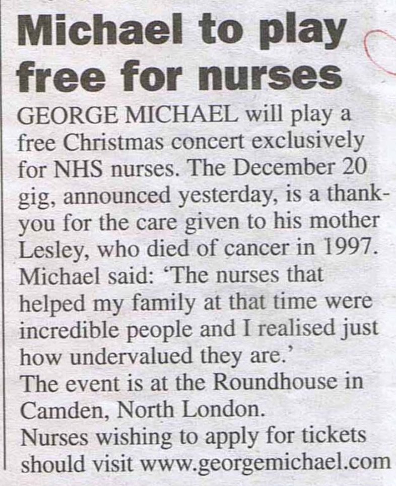 Видання зазначає, що Майкл майже через 10 років після того, як його мати у 1997 році померла від раку, влаштував безкоштовний концерт для медсестер лікарні, де лікувалась жінка.