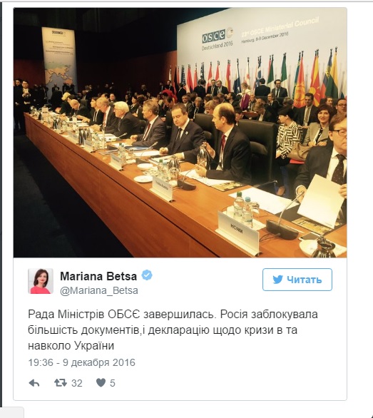 "Совет Министров ОБСЕ завершился. Россия заблокировала большинство документов и декларацию о кризисе в и вокруг Украины", - пишет спикер МИДа.