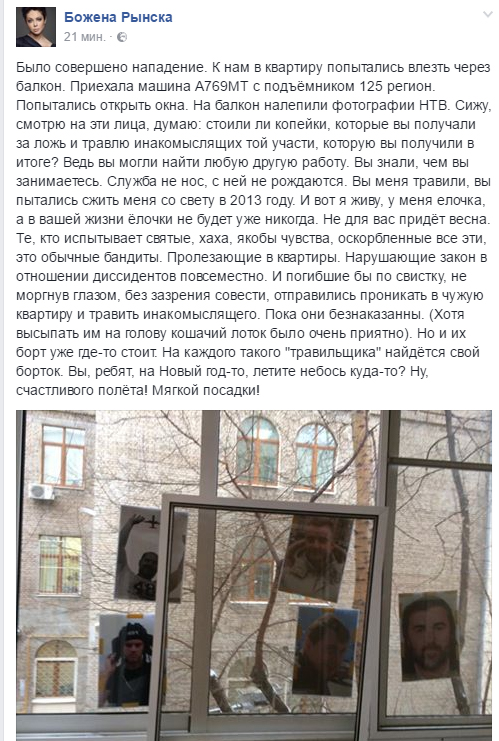 “Было совершено нападение. К нам в квартиру попытались влезть через балкон. Приехала машина А769МТ с подъемником 125 регион. Попытались открыть окна. На балкон налепили фотографии НТВ. Сижу, смотрю на эти лица, думаю: стоили ли копейки, которые вы получали за ложь и травлю инакомыслящих той участи, которую вы получили в итоге? Ведь вы могли найти любую другую работу. Вы меня травили, вы пытались сжить меня со свету в 2013 году. И вот я живу, у меня елочка, а в вашей жизни елочки не будет уже никогда”, - написала Рынска.