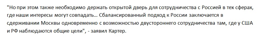 Глава Пентагона и министр обороны США Эштон Картер вновь выступил с жесткими обвинениями в адрес России. Он заявил, что Кремль является главным источником провокаций и агрессивных действий в нынешней Европе, что явно указывает на то, что высокая степень конфликтности с РФ сохраняется.