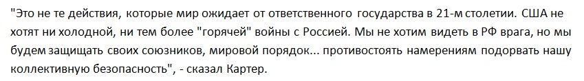 Глава Пентагона заявил, что Россия очень хочет, чтобы ее считали сильной страной. При этом сама Россия действуют как преступник, увеличивая конфликт на украинском Донбассе и разрушая сотрудничество в Сирии. По словам Картера, РФ продолжает проводить хакерские атаки и гремит ядерным оружием.